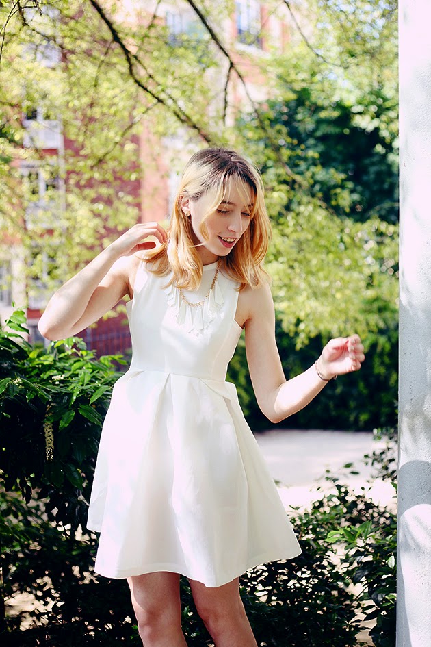 Porter du blanc des pieds à la tête, il y a rien de plus pratique quand on attend les 25 degrés à Paris ! Voici donc une nouvelle tenue "all white everything" comme je les aime (revoir la première). En robe cette fois ci, ce qui me donne un peu l'air de sortir d'une communion mais hé, au moins ça rayonne ! Dedans, quelques accessoires tous droits sortis de ma première commande sur River Island. Après avoir fait un tour dans leurs boutiques à Londres pour tâter le terrain, j'avais craqué sur ce collier, hésité et finalement une fois revenue chez moi, je n'arrêtais pas d'y penser. Thank God internet existe !